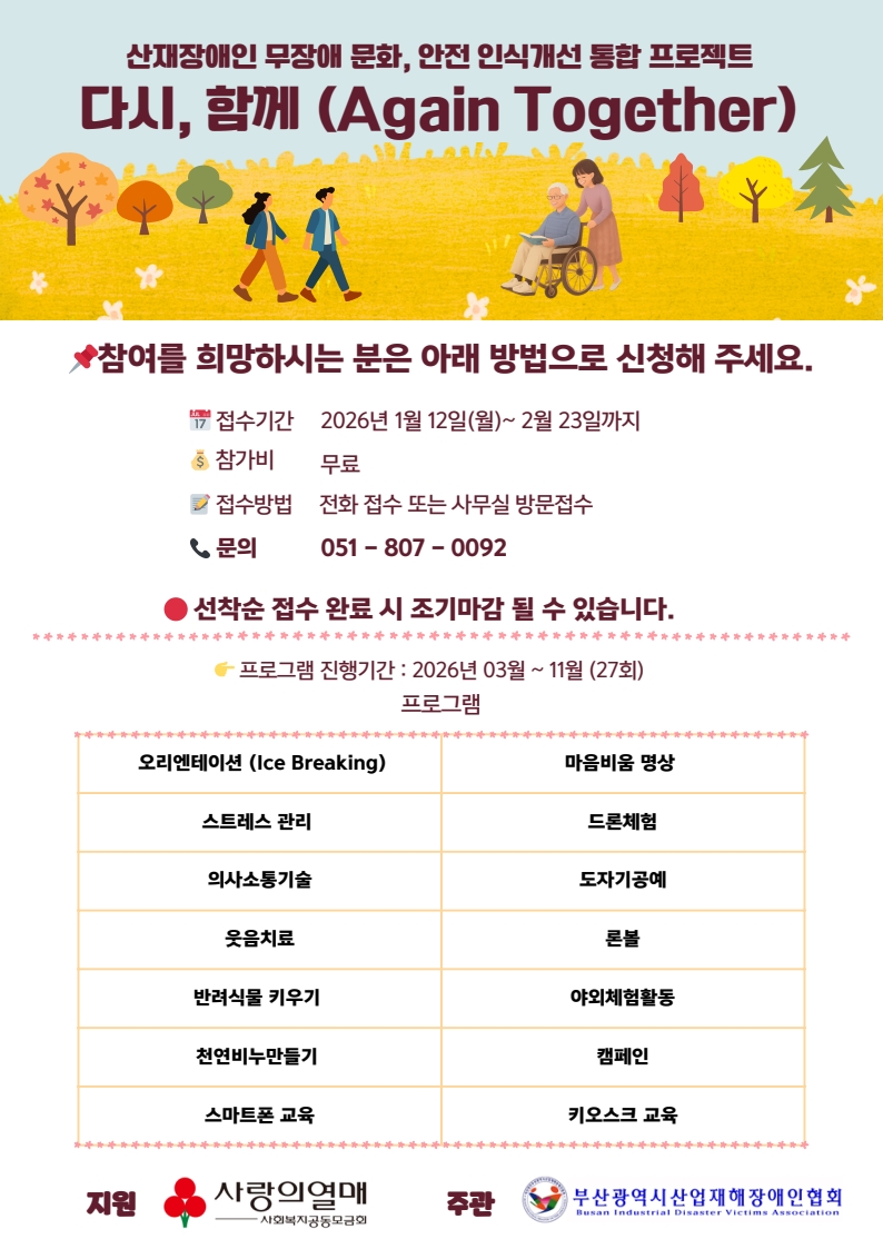 °øµ¿¸ð±Ýȸ¿¡¼ Áö¿øÇÏ´Â "»êÀçÀå¾ÖÀÎ ¹«Àå¾Ö ¹®È, ¾ÈÀü Àνݳ¼± ÅëÇÕ ÇÁ·ÎÁ§Æ® : ´Ù½Ã, ÇÔ²²(Again Together)" Âü°¡ÀÚ¸¦ ¸ðÁýÇÕ´Ï´Ù.